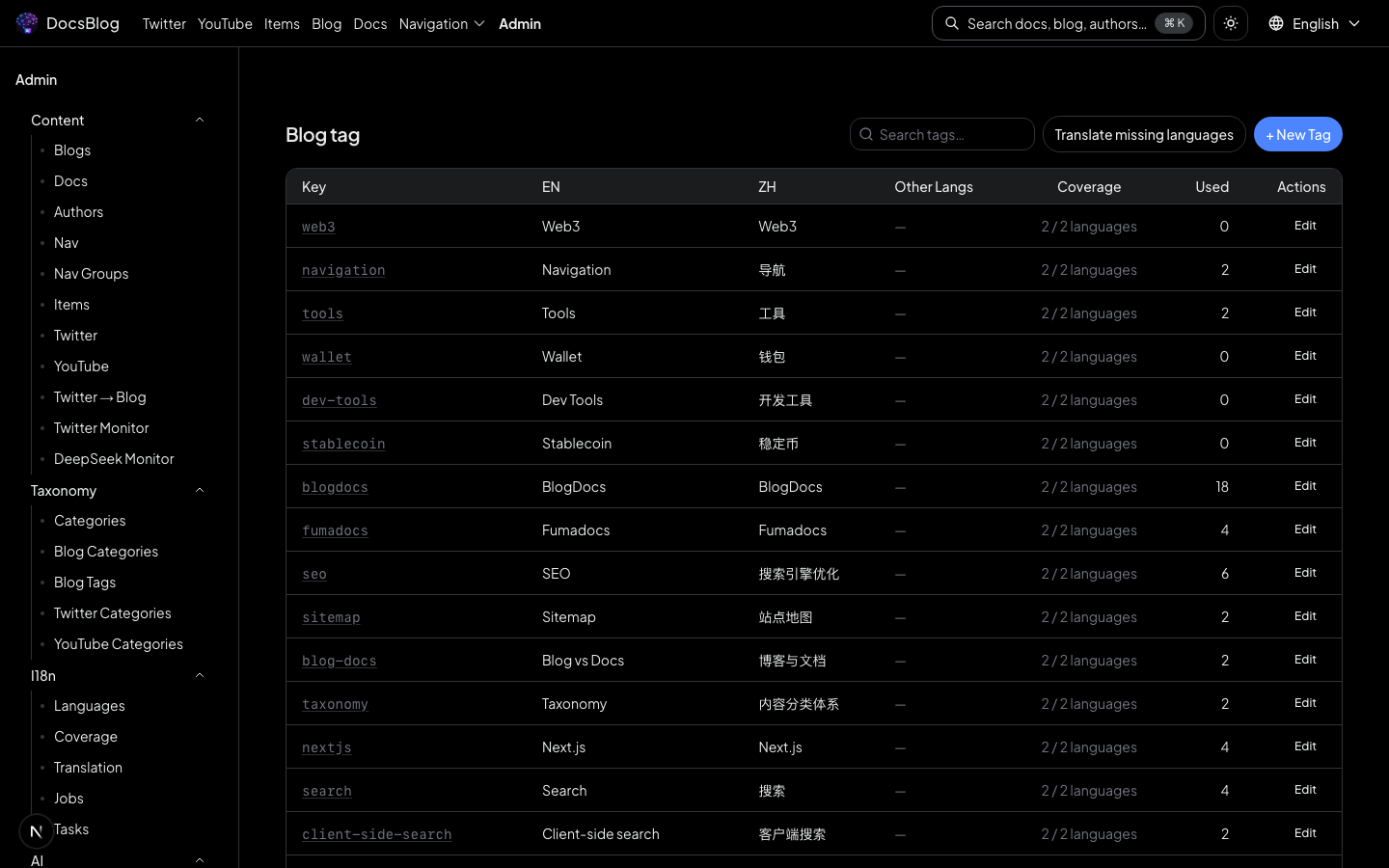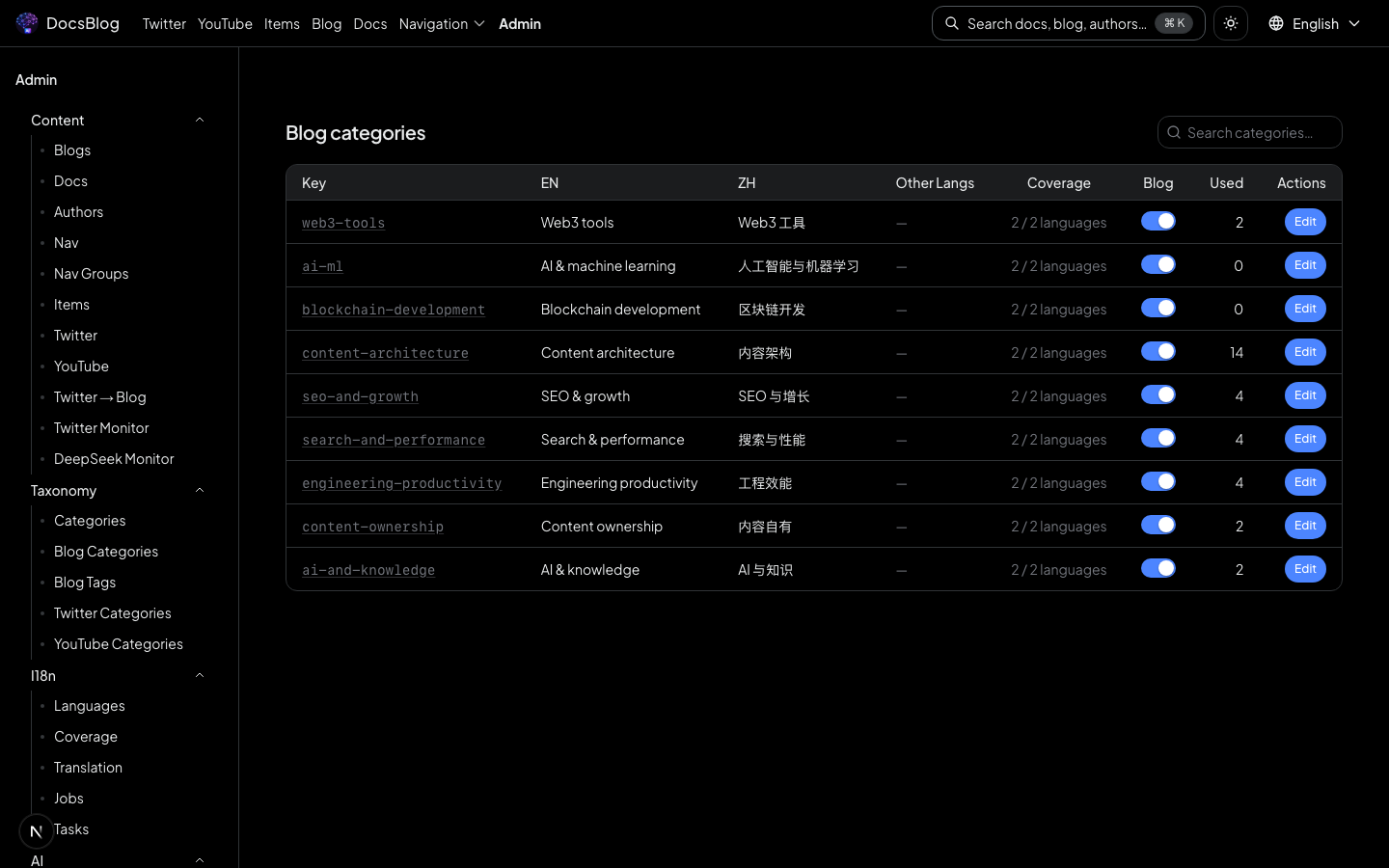 - Create a new category with a slug and i18n display names (English and Chinese)