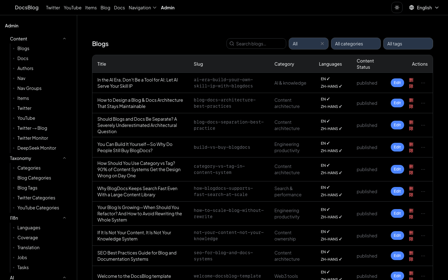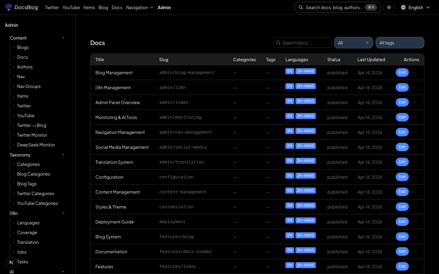 Create, edit, and organize blog posts, categories, tags, and authors through the admin panel.