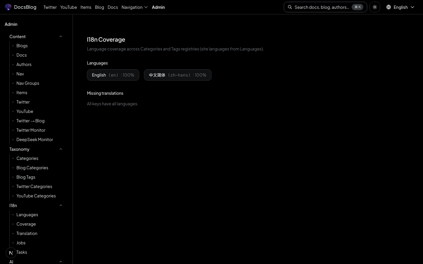 Navigate to /admin/i18n/coverage to view translation coverage per language. Quickly identify which content is missing translations.