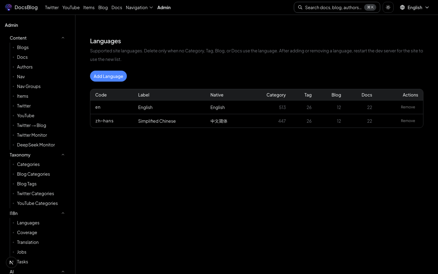 Navigate to /admin/i18n/languages to view and manage the project's supported languages.