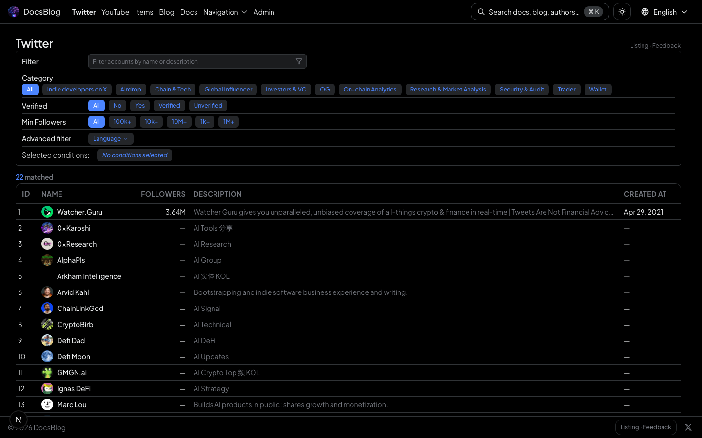 Curate and showcase Twitter accounts and YouTube channels that matter to your audience — with high-performance rendering and category-based organization.