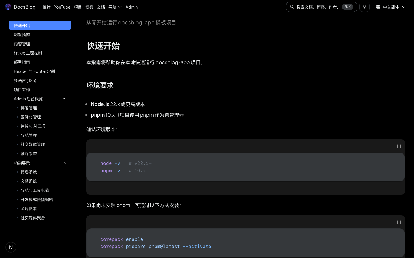 DocsBlog 的文档系统基于 fumadocs 引擎构建,提供专业级的文档阅读和管理体验,适合产品文档、技术手册、知识库等多种场景。